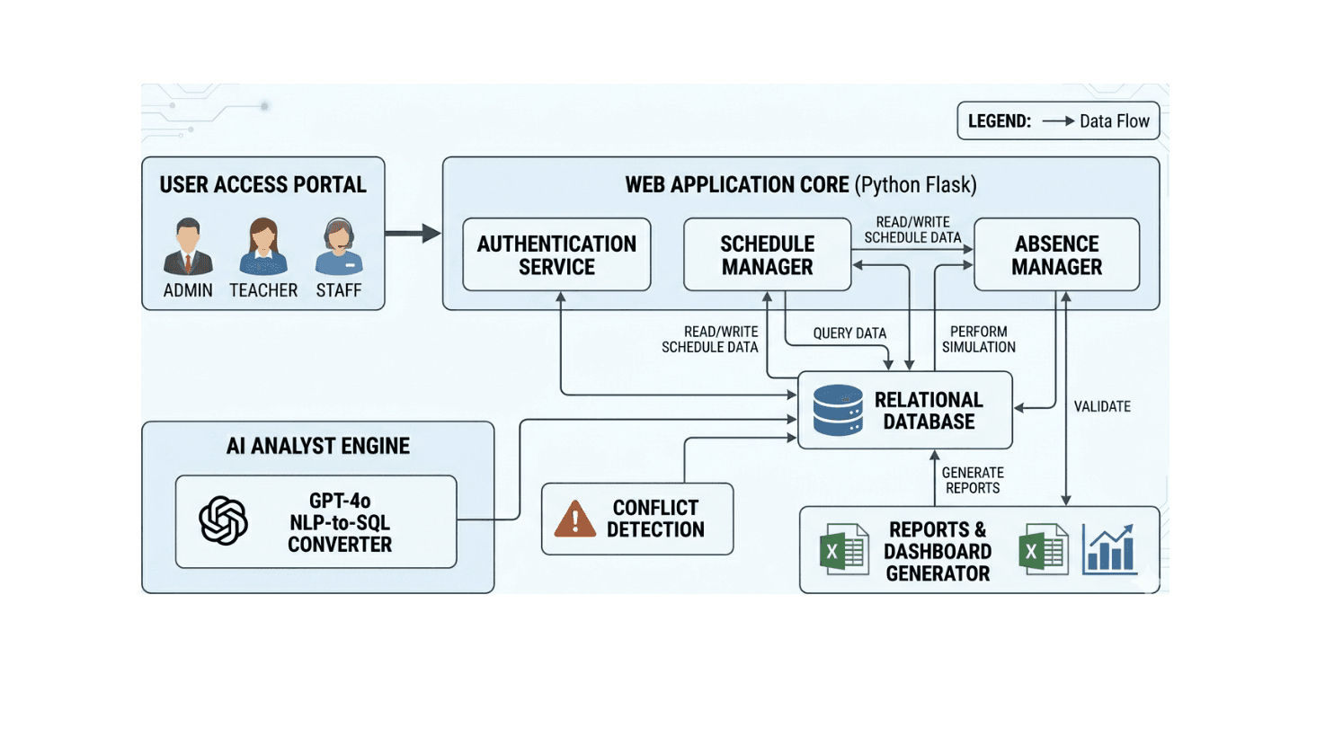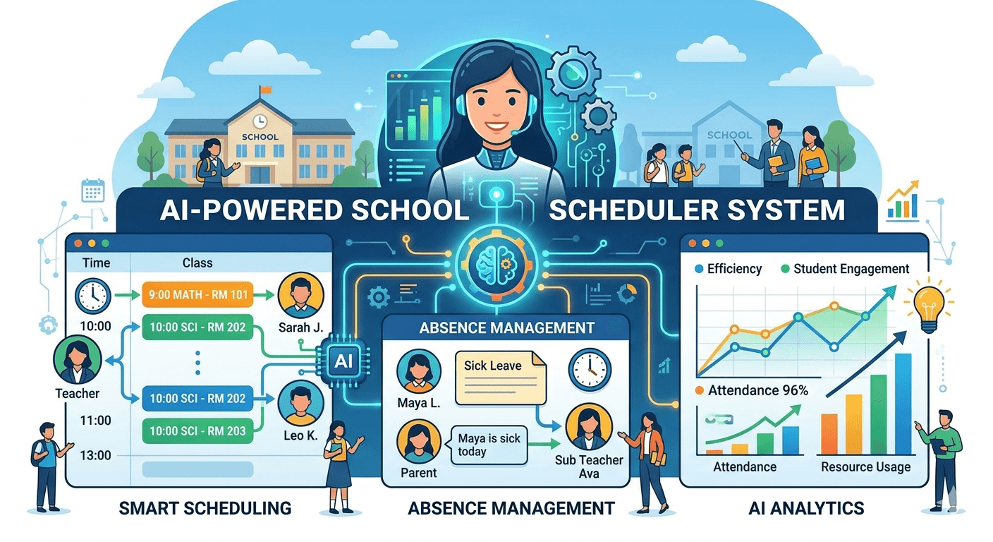 An intelligent school scheduling platform designed to automate timetables, streamline absence management, and optimize substitute allocation. Built on a scalable cloud architecture with integrated AI capabilities, it enables real-time simulations, conflict detection, and natural language insights. The result is a centralized system that enhances operational efficiency, improves decision-making, and delivers complete visibility across academic workflows.